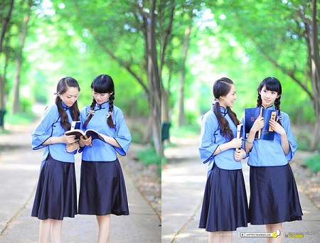 Nhắc đến “sườn xám” người ta liền nghĩ ngay đến Trung Quốc, một nét văn hóa đặc trưng của đất nước này. Với cổ áo được cách điệu từ “sườn xám” cùng chiếc váy xanh, nữ sinh Trung Quốc không thể dấu đi nét trẻ trung, tươi tắn khi khoác lên mình bộ đồng phục học đường này.